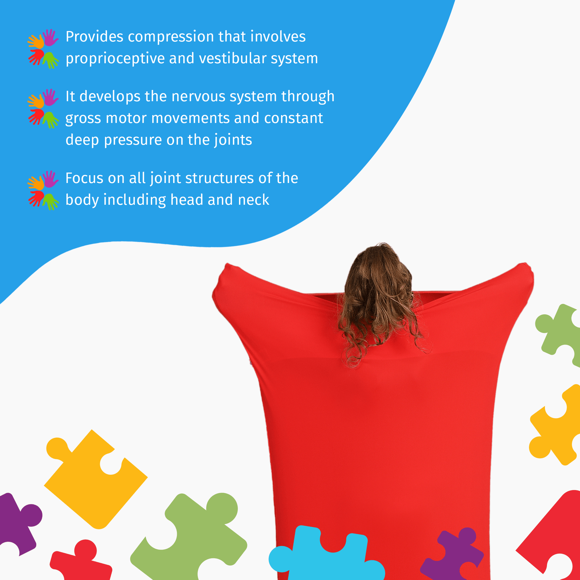 - Conçu comme un outil thérapeutique : suffisamment serré pour favoriser le besoin d'étirements continus et améliorer la motricité globale (équilibre, flexion, étirement, traction et torsion)