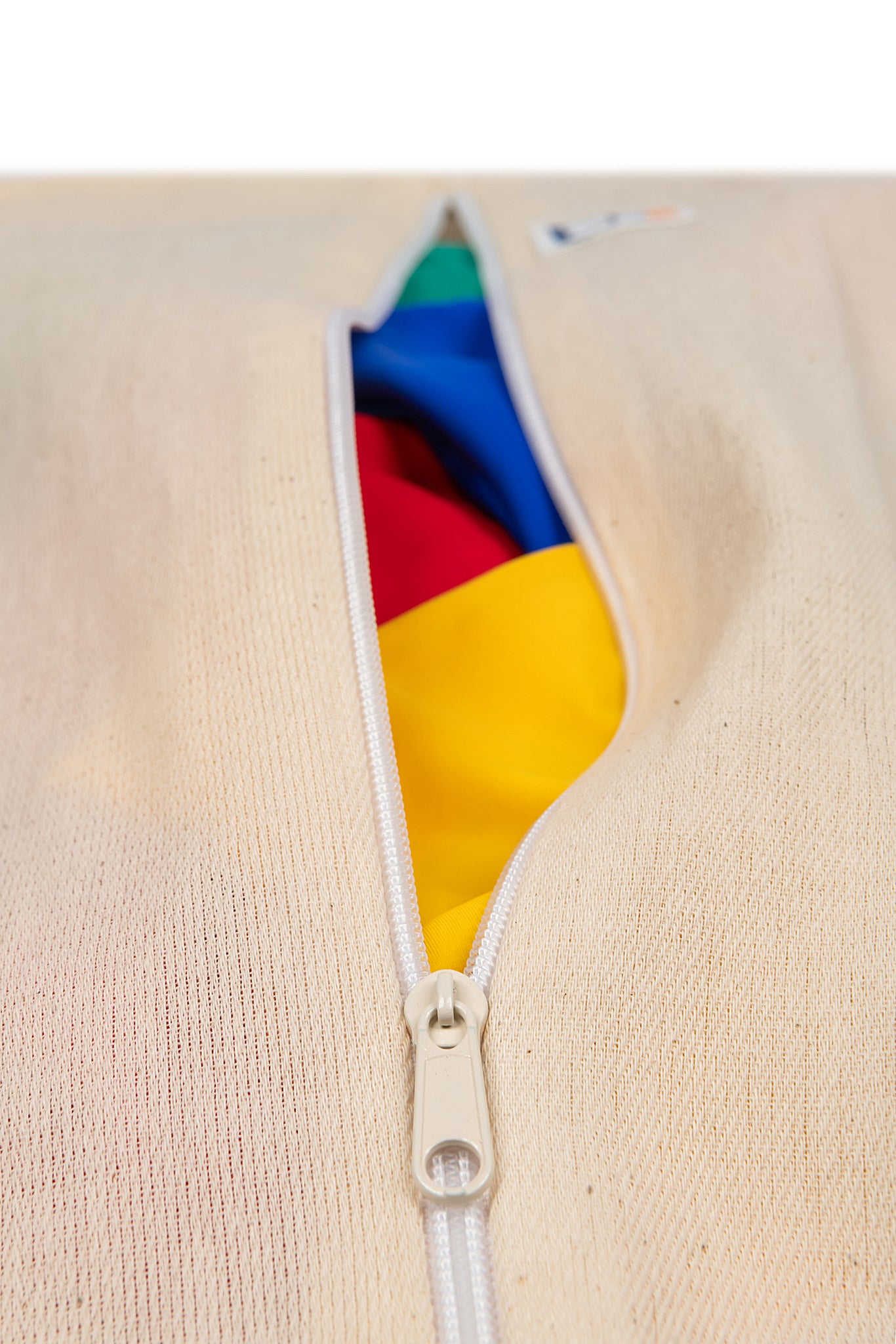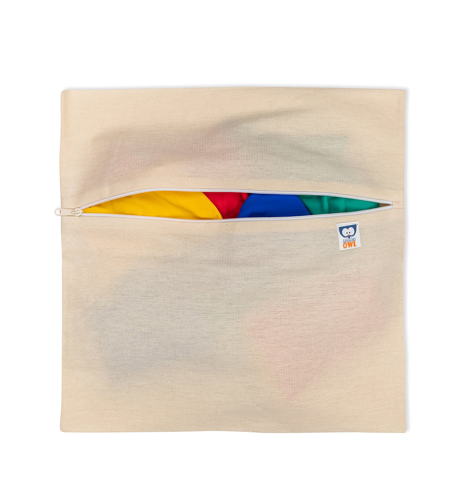 The pack is made of 12 bean bags made of recycled waste pieces of lycra. We are committed to sustainable production, therefore, utilising every piece of fabric is left unused. The bag is made of natural undyed cotton. Bean Bags are filled with natural gravel instead of plastic pellets. Natual gravel gives an extra tactile input and is great fun to play.